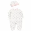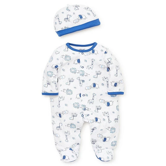- This matching footie and cap set from Little Me features a fun animal pattern on soft cotton fabric for ultimate cuteness and comfort