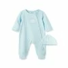 - Little Me's Cute Puppies Footie and Hat Set features a darling canine print in blue and brown on ivory