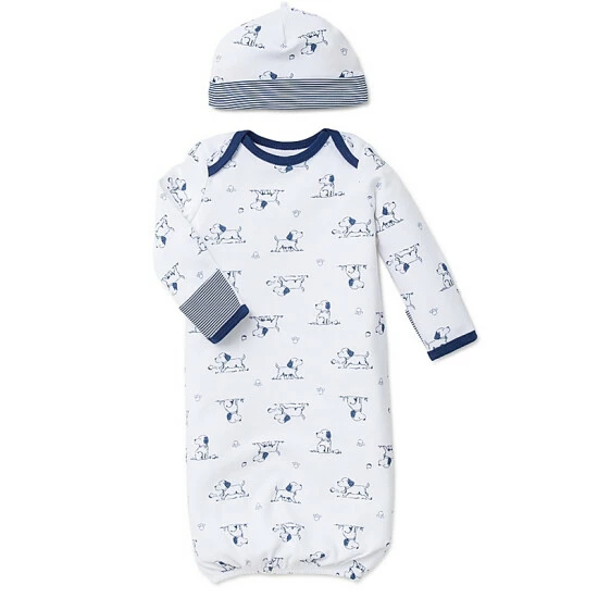 - This Little Me 2-Piece Puppy Toile Gown and Hat Set features a super-cute romping puppies print in navy on white