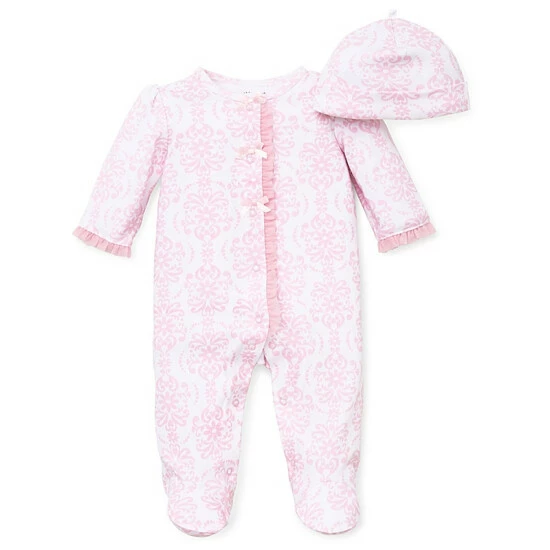 - In a sweet pink, this Damask Scroll Footie and Hat Set from Little Me is cute yet elegant