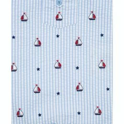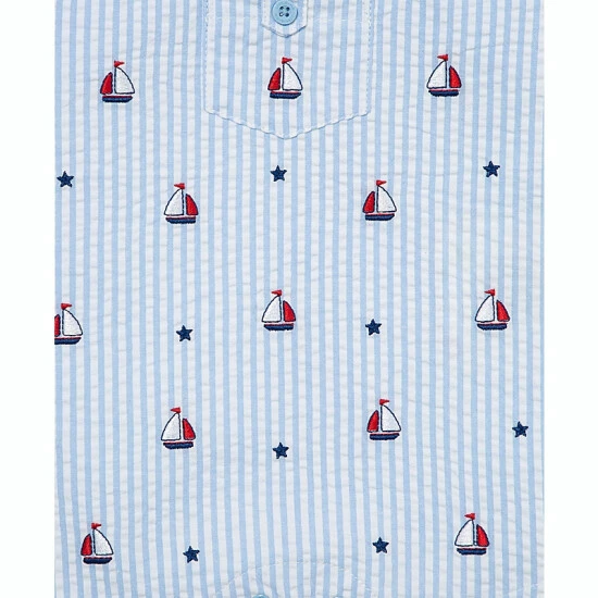 - Light blue seersucker adorned with a sailboat motif, adding relaxed charm