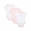 - Snap-front, kimono-style, solid pink footie with embroidered “Welcome” chest